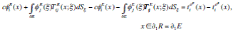 This integral representation allows the calculation of stresses and tractions by directly applying the Hooke’s law and Cauchy’s equation, except for the case when x is equal to ξ on surface S that correspond to the boundary singularities. From a limiting process based on equilibrium considerations around an internal neighborhood of the boundaries and interfaces on which respective conditions are imposed, it is possible to write, for x on S,