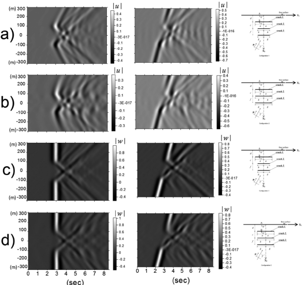 Figure 10 Synthetic seismograms of the displacement field for a line of surface receivers. Normalized horizontal displacements ∣u∣ are shown in a) and b), while vertical ones ∣w∣ in c) and d). The medium contains two different crack configurations, indicated at the right-hand side of the seismograms. The excitation is given by a normal (left) and oblique (right) P-wave incidence.