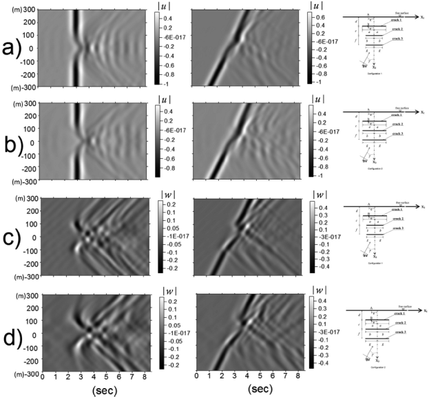 Figure 11 Synthetic seismograms of the displacement field for a line of surface receivers. Normalized horizontal displacements are shown in a) and b), while vertical ones ∣w∣ in c) and d). The medium contains two different crack configurations, indicated at the right-hand side of the seismograms. The excitation is given by a normal (left) and oblique (right) SV-wave incidence.