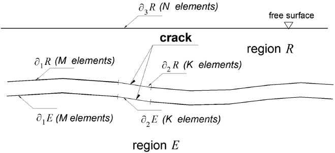 Figure 2 Configuration by regions R and E of the elastic half-space. The free surface is discretized in N elements, the crack in K elements, and the common interface among R and E in M elements.