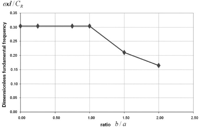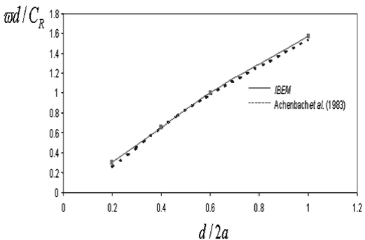 represents the Rayleigh’s wave velocity. It is remarkable the good agreement between IBEM results with the results reported by Achenbach et al., (1983). As seen, the dimensionless frequency augments from about 0.3 to 1.6 as the normalized depth increases from 0.2 to 1.