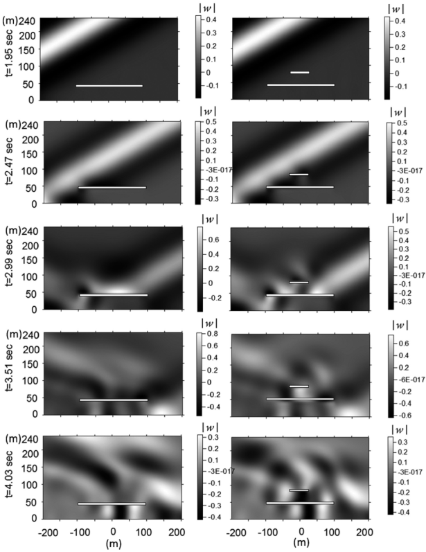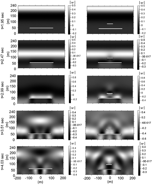 In order to show similarities and differences of the total diffractions generated by a single crack and two-parallel crack models, snapshots of the vertical displacements ∣w∣ for five consecutive times are presented. We have studied the spatial distribution of amplitudes during a lapse of propagation time using meshes 400 x 240 m of evenly spaced receivers. The instant frames of time were obtained by convolution of a Ricker wavelet of t p =1s and λ c =a/2=50m of wavelength, followed by an inverse Fourier transform and then plotted as images. Snapshots are useful to understand by means of visualization, among other physical characteristics, the diffraction and polarization effects of the displacement field, particularly in time domain. In Figure 7 and 8, the snapshots that correspond to the single crack system are depicted in the left section of the figure, while the right portion covers the snapshots of the two-parallel crack system. In all cases, it is important to point out that the free surface is located at the bottom of each snapshot and the incident waves travel toward the free surface. The time increment between each correlative snapshots is 0.52 s. For simulations, a characteristic period of t p =1s has been selected for the Ricker’s incident pulse. Figure 7 shows normal P wave incidence exciting a medium with a single crack (left) and two cracks (right). For both cases, crack 1 is located at d/2a=0.2 while crack 2 is at c=d and a ratio of b/a=0.25 is considered. For times t=1.95 and 2.47 s, the incident pulse is clearly seen as a lighter and complete bar. In contrast, diffracted wave fields are observed for times from t=2.99 to 4.03 s. A strong diffraction in the interior of the medium is observed at t=3.51 s in the single crack model. Otherwise, a completely different scattering pattern is seen for the case of two cracks, where less number of diffracted waves are produced from the smaller crack. The presence of the shorter crack reduces the wave amplitude of the incident field before it impacts the nearest free surface crack. In this case, despite of single and multiple scattering patterns exhibited at t=3.51 s, the displacement field observed at the free surface for both cases result very comparable. Similarly, the wave propagation patterns observed in Figure 7 were also detected for the oblique incidence of P waves (γ=30º) depicted in Figure 8, in which the displacement fields at the free surface are also controlled by crack 1.