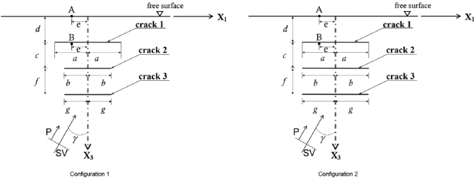 in general, three parallel cracks are included in the media at different depths. Crack 1 is the shallowest at depth d, while depth between crack 1 and 2 is equal to c. The total length of crack 1 is 2a and crack 2 has a length of 2b. The third and deepest crack, has a length of 2g with a depth of d + c + f and ratio d/2g =0.6. The cracks are centered with respect to axis X3. Both, P and SV waves propagate towards the free surface with an angle of incidence γ. Finally, points A and B represent locations of interest for the numerical analyses at a distance e from X3. Point A is positioned at the free surface level and point B is at the same depth of crack 1.