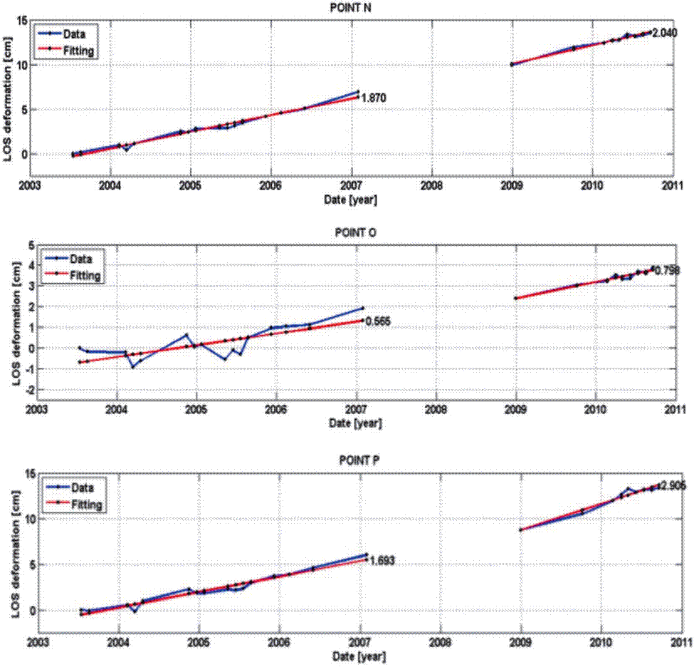 Figure 10 Time series for points N, O and P located in the vicinity of La Colina fault (Figure 5). The solid blue line indicates the ground deformation estimated from the inversion process of the InSAR images in Line of Sight (LOS) of the satellite. The solid red line indicates the best linear fit of the deformation model; the numbers indicate the average annual subsidence rate.