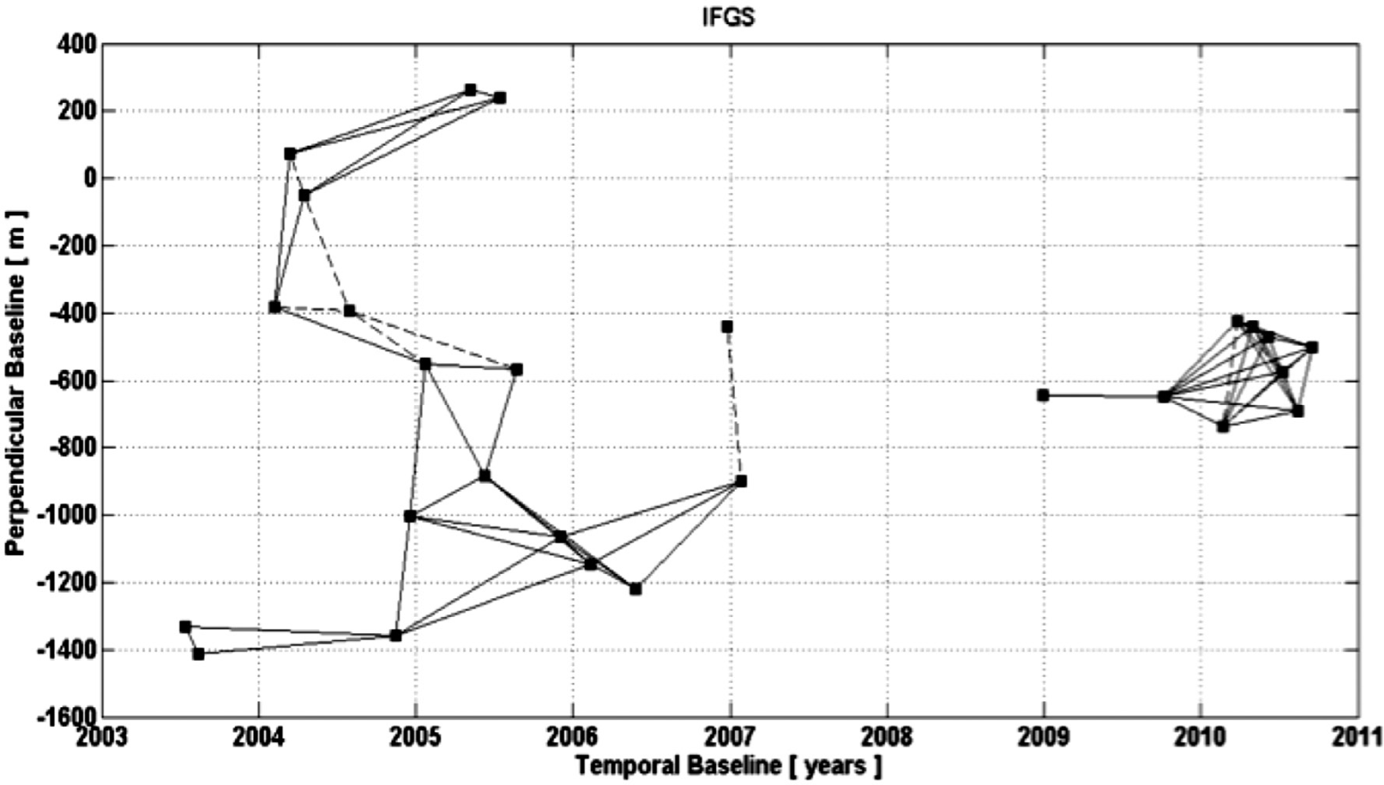 In order to avoid loss of coherence in the interferograms, their baselines were limited to 1) spatial perpendicular baselines of less than 400 m; and 2) temporal baselines of less than 420 days. As a result, 65 interferograms were selected, constituting two separate groups (Figure 2). The first one spans from July 2003 to January 2007, and the second from December 2008 to September 2010. Unfortunately there are no InSAR acquisitions in the region from February 2007 to November 2008. Usai (2003) proposed to overcome large gaps in the interferometric data by creating synthetic interferograms that predict a particular deformation behavior. However, the period missing is very long to select a priori a reliable behavior. Therefore, the two observational periods are treated as independent groups.