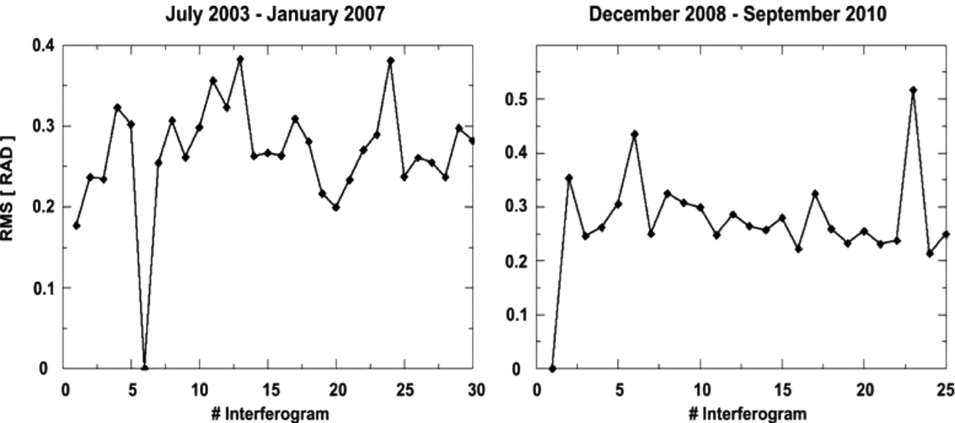 Fifty-five interferograms were used in the analysis (Tables 2 and 3). The RMS values of the interferograms used to evaluate the time series are described in equations 2 and 5 in Appendix A and graphically shown on Figure 3.