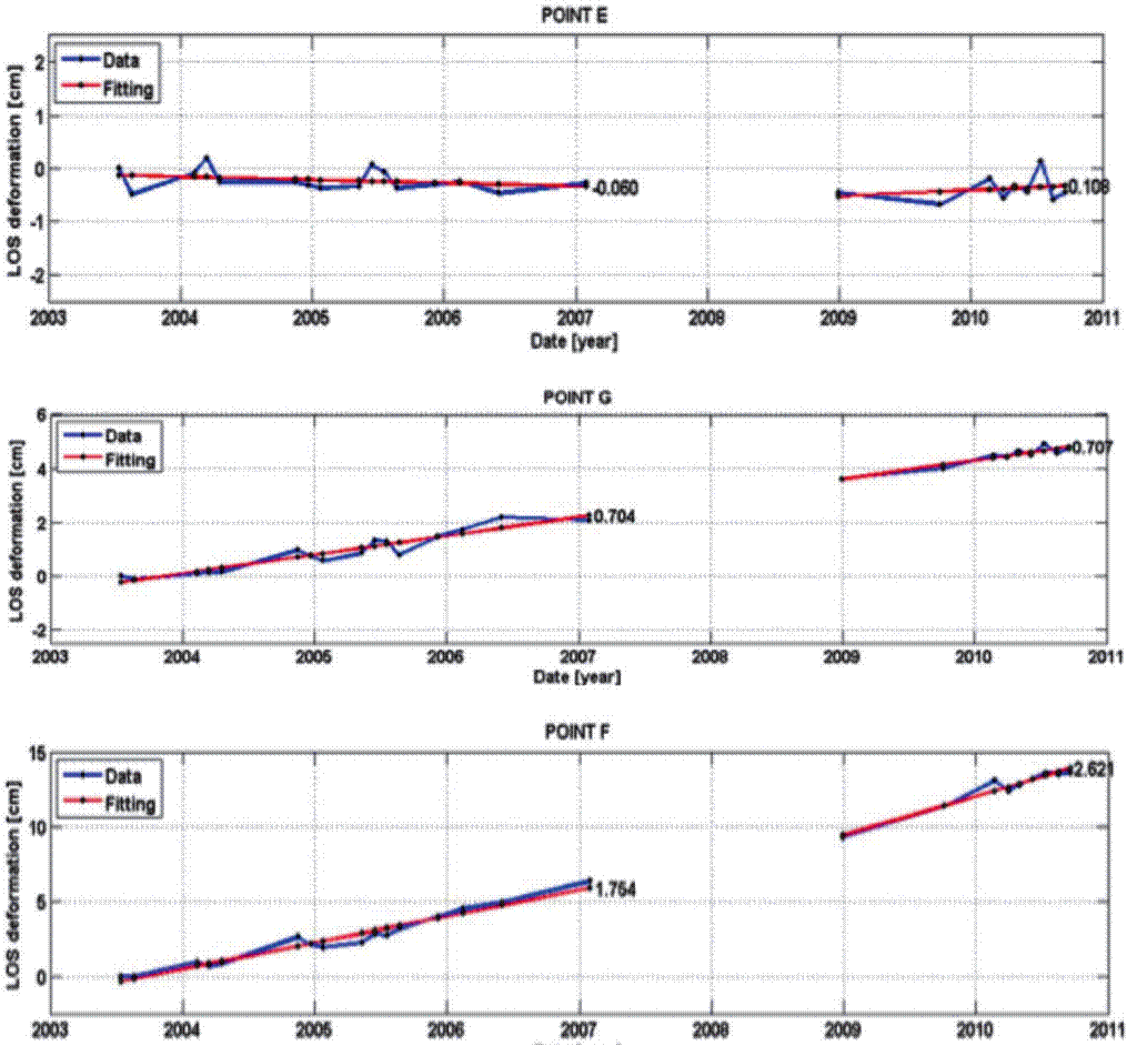 Figure 6 Time series for points E, G and F located in the vicinity of La Paloma fault (Figures 1 and 4). The solid blue line indicates the ground deformation estimated from the inversion process of the InSAR images in Line of Sight (LOS) of the satellite. The solid red line indicates the best linear fit of the deformation model; the numbers indicate the average annual subsidence rate.