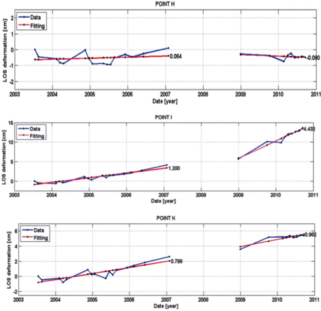 Figure 8 Time series for points H, I and K located in the vicinity of the Central Camionera fault (Figure 5). The solid blue line indicates the ground deformation estimated from the inversion process of the InSAR images in Line of Sight (LOS) of the satellite. The solid red line represents the best linear fit of the deformation model; the numbers indicate the average annual subsidence rate.