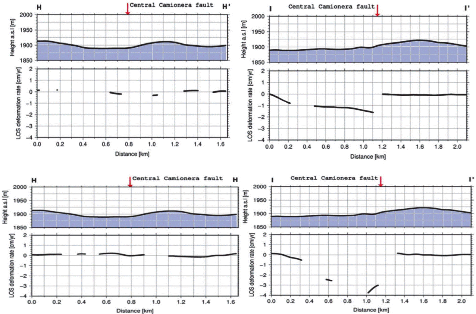 Figure 9 Cross sections HH´ and II´ across the Central Camionera fault as shown on Figure 4a. The topography is shown on top and the deformation of the ground estimated from InSAR is shown at the bottom. The upper image of each cross section depicts the period from 2003 to 2007; the lower pane reflects deformation from 2008 to 2010.