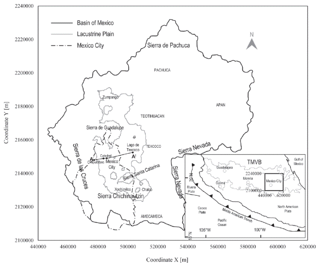 Mexico City is located within the southwestern portion of the Basin of Mexico (Figure 1). Conventionally, the Valley of Mexico refers to the lowest area of this basin. It is essentially an extensive plain at an average altitude of 2240 m above sea level formed by low strength, very compressible, lacustrine clayey aquitards partially overlying highly productive regional aquifers of volcanic and sedimentary origin. Over 20 million people in Mexico City and its metropolitan area rely on groundwater as their main water resource. Currently, greater rates than can be naturally replenished are being subtracted from one of these aquifer units, so in several detected locations it is overexploited (Conagua, 2009; NRC, 1995).