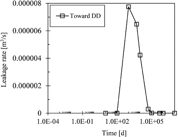 Figure 11 presents the behavior of leakage rates crossing the top boundary of the DD as a function of time. Again, the injection rate is equal to 0.004 m3s-1. A quite short period of time (100 d) is needed for the injection of the HL to influence the DD because the thickness of the LC formation is quite small (only 8 m). From 100 d to 1000 d of injection, leakage rates increase. However, a rather small leakage rate (lower than 0.000008 m3s-1), reaches the DD after 1000 d of injection. As the injection period increases, this leakage rate tends to a very small value. This is in agreement with Figure 9 for DD results. At time t=10000 d, head buildup seems constant. Note that the decrement in leakage rates for longer periods of time corresponds to the steady state condition that is reached in the UC formation, as the leakage rate in the upper aquitard tends to the injection rate value. Considering the leakage rate crossing the LC formation, an insignificant influence is expected of the injected water on the physical-chemistry composition of the native water in the DD, provided the injected and native water are compatible in quality.