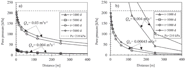 The effect of the injection period can also be seen in the plots of Figure 5. It shows that in passing from 1000 d to 5000 d of injection, pore pressure does not increase significantly near the injection well. As the distance increases, pore pressure is increased around 15-20 kPa for an injection rate of 0.004 m3s-1 (Figure 5a) and around 10 kPa for an injection rate of 0.002 m3s-1 (Figure 5b).