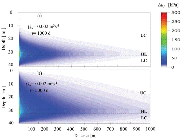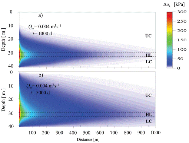 Pore pressure fields through the aquifer-aquitard system generated by the injection well are shown in Figure 7 and Figure 8. The pore pressure fields of Figures 7a and 7b correspond to an injection rate of 0.002 m3s-1 and injection periods of 1000 d and 5000 d, respectively. Figures 8a and 8b show pore pressure fields corresponding to an injection rate of 0.004 m3s-1 and injection periods of 1000 d and 5000 d, respectively.
