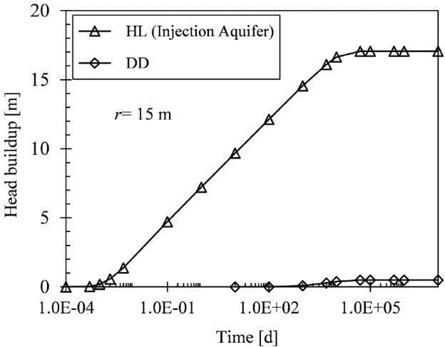 Head buildup in aquifers at a distance of 15 m from the injection well center is plotted in Figure 9 as a function of time for an injection rate of 0.004 m3s-1. As expected, higher head buildup is induced in the injection aquifer (HL, triangles) than in the deep deposits (DD, diamonds). A steady state condition in the injection aquifer is not reached before 10000 d of injection. Thus, a steady state flow condition through the hard layer is not as easily reached as some authors (e.g. Zeevaert, 1982) indicate. After 100 d of injection, head buildup starts developing in the DD (diamonds), but the increments are very small. After 10000 d of injection, the head buildup is lower than 1 m. Therefore, for injection periods shorter than 10000 d, it seems sufficient to measure head buildup in the injection aquifer only during underground injection tasks, since negligible changes in head buildup within the DD should be expected.