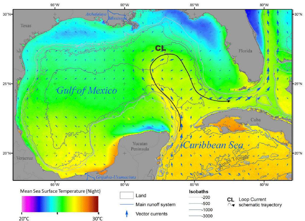 Figura 1 Área de Estudio con el promedio climatológico para el mes de mayo de la temperatura nocturna de la superficie del mar (NST) con los vectores resultantes de la circulación superficial para el mismo mes (flechas azules). En tonos de gris se sobreponen las isobatas más representativas (tonos de gris) y las entradas de los principales afluentes de los sistemas Grijalva-Usumacinta y Atchafalaya-Misisipi. Se presenta un esquema de la trayectoria típica de la Corriente del Lazo (flecha en negro).