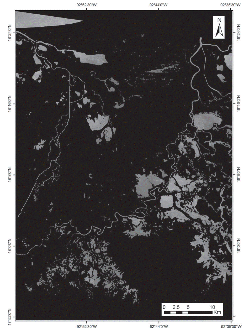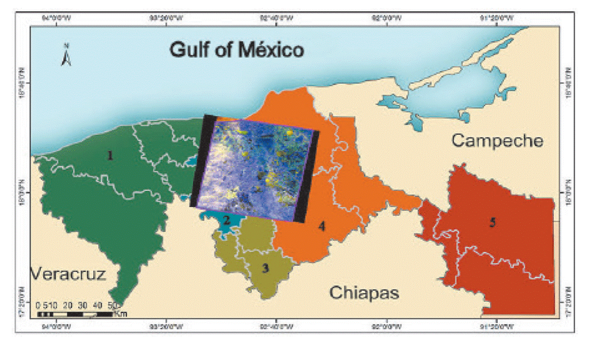 The Centla Wetlands are located in the State of Tabasco to the South East of Mexico (Figure 1). The State of Tabasco is divided into five subregions: (1) Chontalpa, (2) Center, (3) Sierra, (4) Wetlands, (5) Rivers (Rodriguez 2002; Guerra-Martinez and Ochoa-Gaona 2006). The Centla Wetlands are included in the subregions (2) and (3) (Figure 1). The area covered by the satellite image is appreciated in Figure 1. Such image was overlaid over the subregions. Such overlay hinders the boundaries of the subregions. If such boundaries were shown in figure 1, the Centla water bodies would not be appreciated in its full extent.