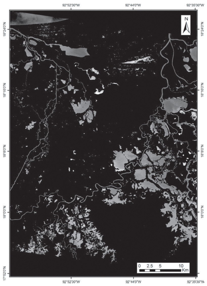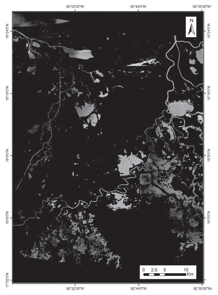 A detailed description of the open water bodies that form the Centla Wetlands is included in the work by Rodriguez (2002). General morphologic and hydrologic conditions of the water bodies are included in such description. Table 1 provides basic geophysical details about the subregions. To develop the model proposed in this research, a Terra/Aster image was acquired (Table 2 and Figure 1).