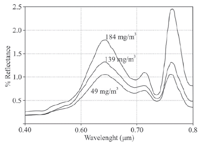 The Chlorophyll-a is a photosynthetic Pigment. The concentration of Chlorophyll-a provides an indication of the volume of aquatic plants present in a water column. This Pigment is present in all groups of algae in coastal water bodies. The spectra for several concentrations of Chlorophyll-a shows a low reflectance in the bands corresponding to blue and red (Menken et al., 2006) (Figure 7). Instead, in the bands of green and near infrared, a high reflectance is observed (Figure 7). On the grounds of the behaviour of such spectra (Doña et al., 2014; Bonansea et al., 2015), the model to calculate Chlorophyll-a is then