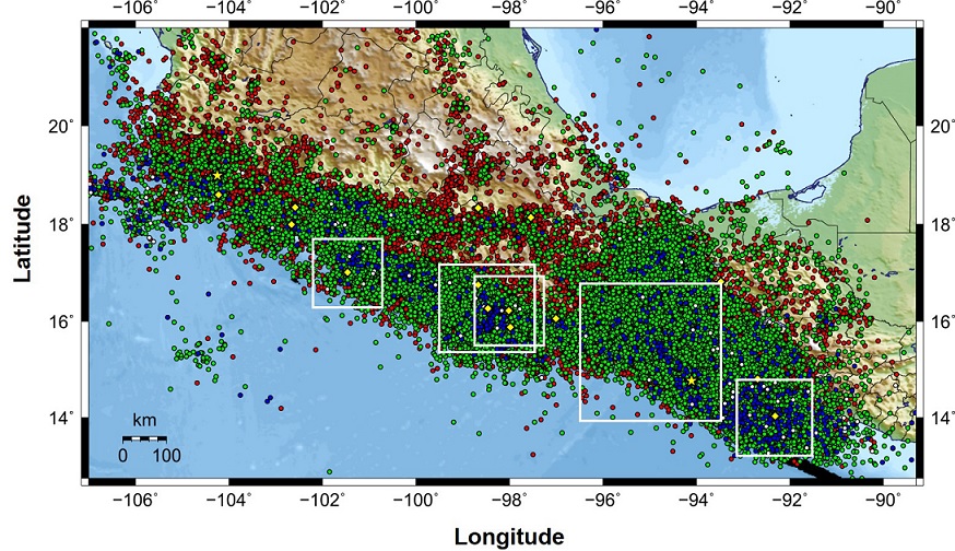 Figure 2 The squares indicate regions used for b value determination for large earthquakes along the Mexican subduction zone; from West to East: Guerrero 2014, Oaxaca 2012, Oaxaca 2018, Oaxaca-Chiapas 2017, Chiapas-Guatemala 2012. Dots represent epicenters: red M < 4.0, green 4.0 ≤ M < 5.0, blue 5.0 ≤ M < 6.0, grey 6.0 ≤ M < 7.0; Yellow diamond with 7.0 ≤ M < 8.0, and Yellow stars with M ≥ 8.0.