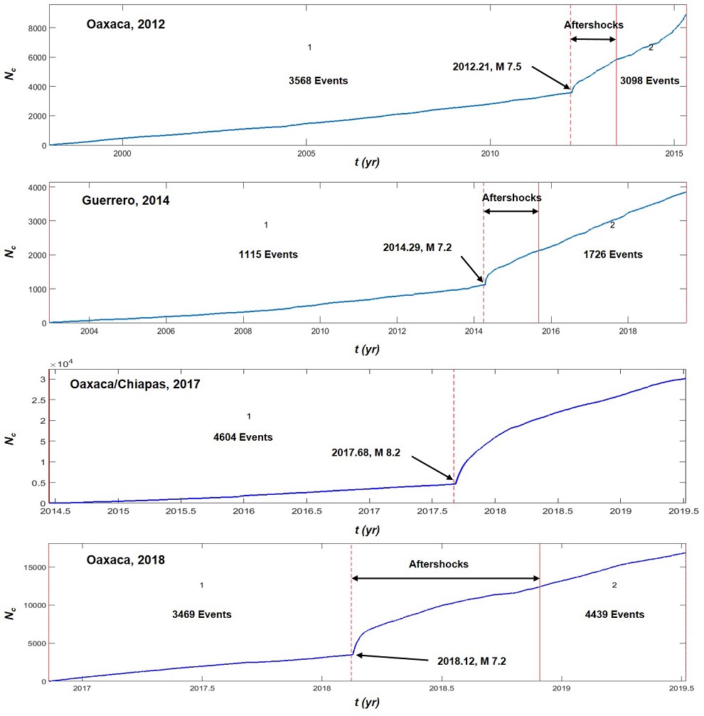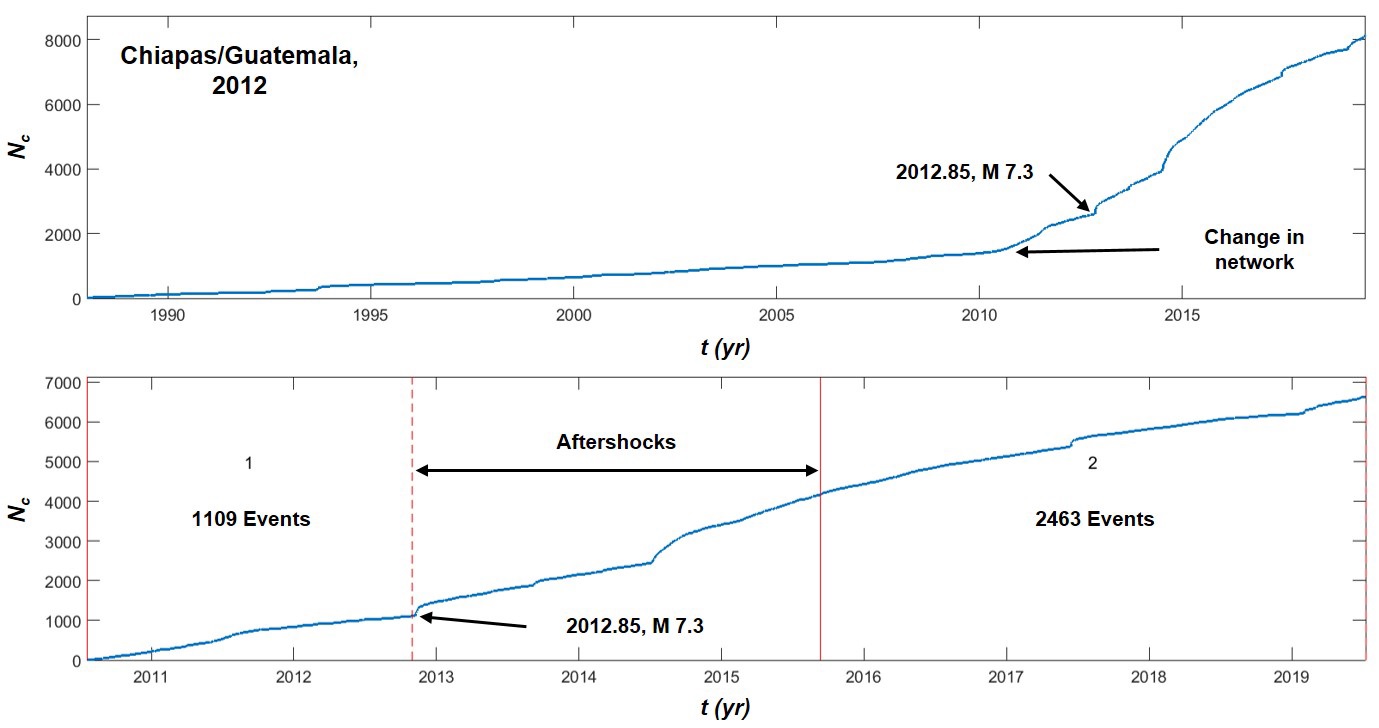 As an example, Figure 3 shows the selection of pre and post-events for the 2012.85, M 7.3 earthquake located at the Mexico (State of Chiapas) ( Guatemala border. From the cumulative curve for the whole region (Figure 3-Top), a clear change in the slope, possibly due to changes in the seismic network, is apparent around 2011, so that we used events from this point on to the end of the catalog. The pre- and post-mainshock time windows, which will be referred to as W1 and W2 from now on, are shown in Figure 3 (Bottom).