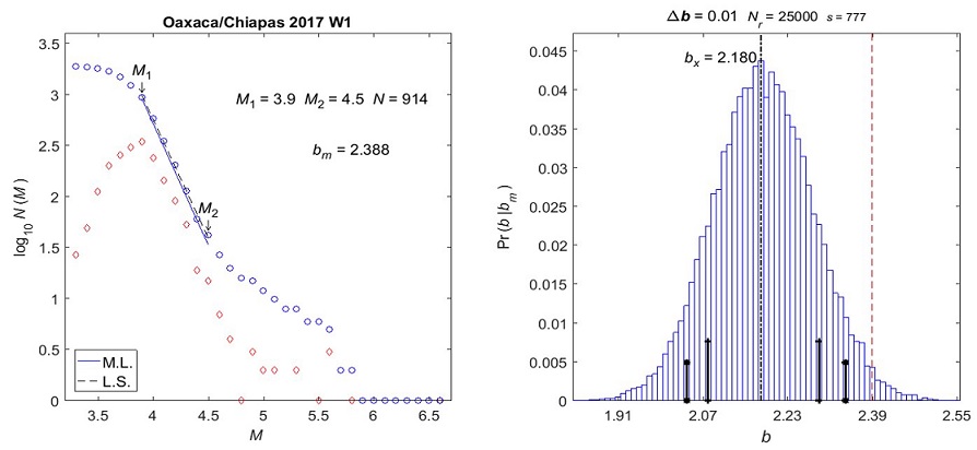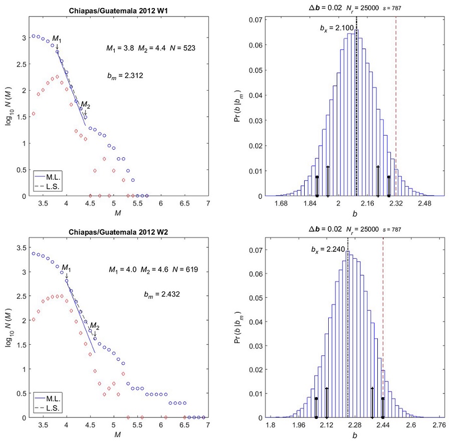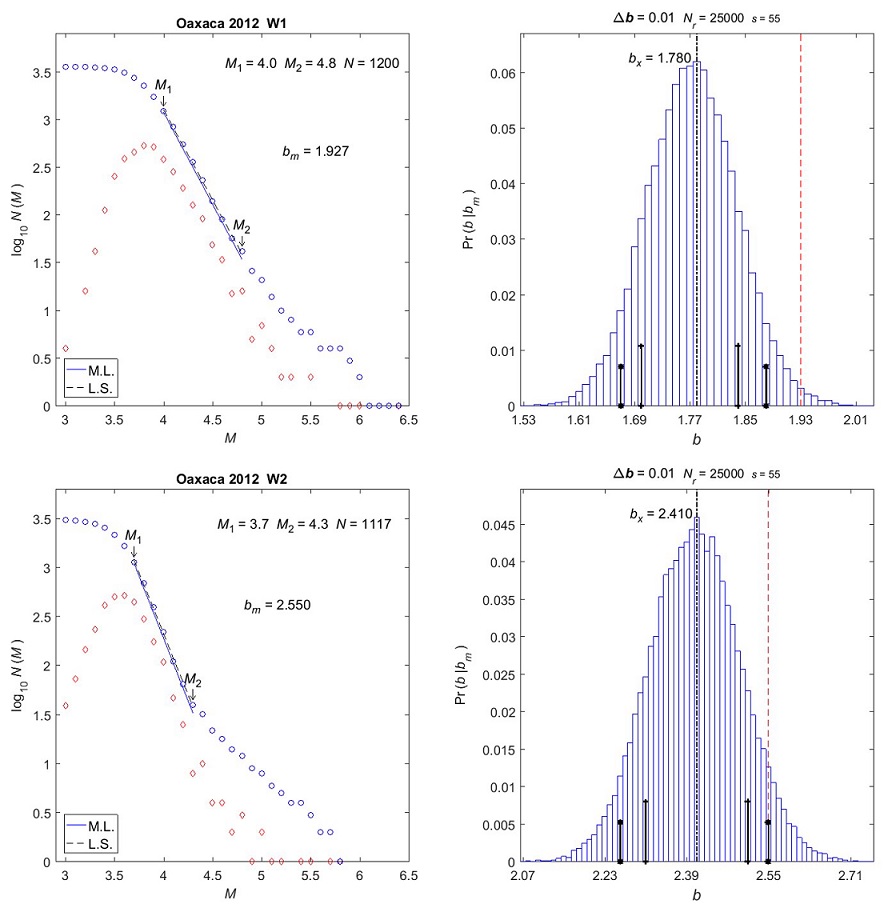 Figure 5 Oaxaca 2012. Left: G-R fit for bm ; (blue) circles are the G-R histogram, and (red) diamonds show the corresponding non-cumulative distribution; N is the number of data in the linear range from M1 to M2 ; M.L. is the straight line corresponding to bm the maximum likelihood fit; L.S. is the dashed line for the least-squares fit (shown for comparison only). Right: b likelihood distribution; Δb is the class width, Nr is the number of Monte Carlo realizations, s is the pseudo-random number generator seed; the thin dashed red line indicates bm , the black dash-dot line indicates bx . Short vertical lines with crosses and asterisks indicate 75% and 90% confidence ranges, respectively. Top: Pre-event W1. Bottom: Post-event W2.
