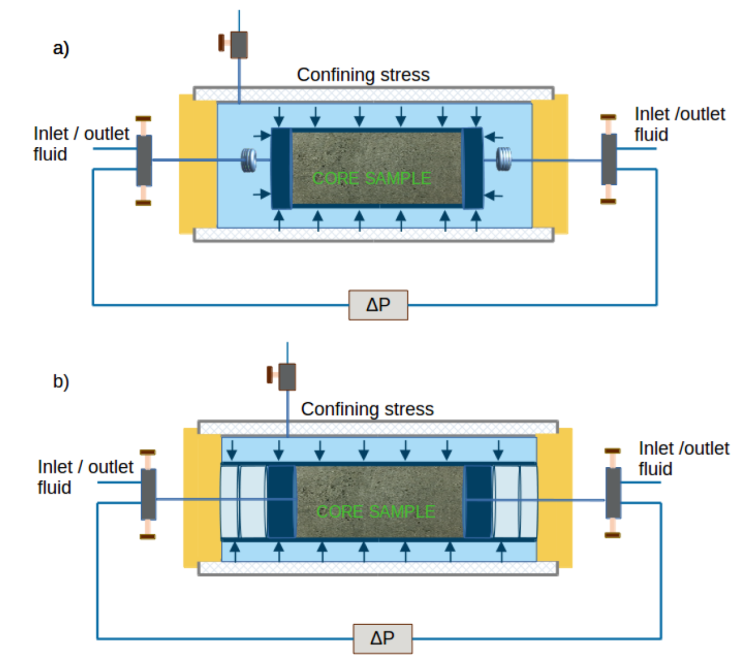 In the non-hydrostatic test, the outlet pressure was controlled by the BPR and the inlet pressure was set by the Quizix pump at constant pressure (6.9 MPa), that is achieved by adjusting its flow rate. The axial stress equals the atmosferic pressure and the boundary condition at the core sample axial faces is zero displacement (see Figure 4). The experiment starts with the application of a series of confining stress for a time period of 40 min. During this time, the inlet and outlet pressures, the pressure drop, the confining pressure, the injected and recovered fluid volumes and the temperature were recorded. These tests are carried out for eight confining stresses as shown in Table 2.