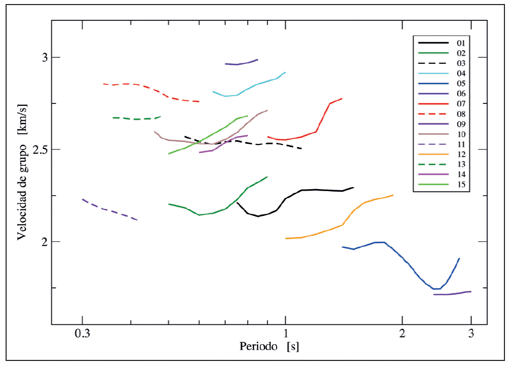 Consideremos primero los resultados obtenidos para los registros de sismos pequeños obtenidos a distancias entre 40 y 118 km. La Figura 2 muestra las curvas de dispersión de velocidad de grupo estimadas a partir de esos registros. Todas las curvas muestran valores elevados de velocidad de grupo, mayores a 1.7 km/s (correspondiente al registro 9). El rango de frecuencias para el cual se estimaron velocidades varía de 0.3 a 3 s de periodo, pero cada registro permite estimar velocidades en un rango pequeño de periodos. Más aun, la banda de periodos de los resultados no se superpone para los 15 registros con excepción del pequeño intervalo entre 0.7 y 0.8 s de periodo, lo que dificulta analizar las curvas conjuntamente. Las longitudes de onda pueden estimarse burdamente en el rango entre 0.6 y 5.2 km. Los resultados no muestran una variación espacial acorde con la distribución de trayectorias. Algunas trayectorias cercanas muestran disparidad en las estimaciones de velocidad de grupo (e.g., 12 y 14), mientras que otras indican resultados cercanos (e.g., 7 y 10). Una única trayectoria (número 5) presenta una forma cercana a la esperada para un modelo sencillo de un estrato sobre un semiespacio. Si se interpreta este resultado en términos de este modelo, para una velocidad del estrato de 2 km/s, se puede estimar un espesor del estrato del orden de 2.1 km. Claramente todas las curvas de dispersión estimadas a partir de registros de sismos corresponden a ondas de Rayleigh que se propagan por una estructura profunda y no permiten estimar valores de velocidades de propagación para los estratos más superficiales, aquellos asociados a los efectos de sitio.