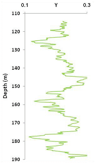 The "Y" parameter includes the sum of radioelements (eU, eTh, and K%) that contribute to the heat production. It seems that the vertical resolution of the (Y) is better than that of the Ra log shown in Figure 4. The variations of (Y) log give insights on the basalt deposition and its geological conditions, and show also a successive of poor and rich radioactive contents (eU, eTh, and K%).