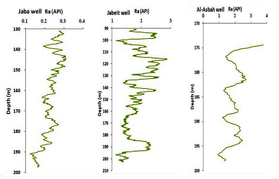 | (Jaba well) Ra (API) | (Jaba well) HP (μW/m3) | (Jabeit well) Ra (API) | (Jabeit well) HP (μW/m3 ) | (Al-Asbah well) Ra (API) | (Al-Asbah well) HP (μW/m3 ) | |