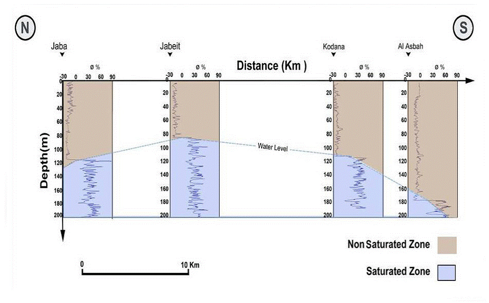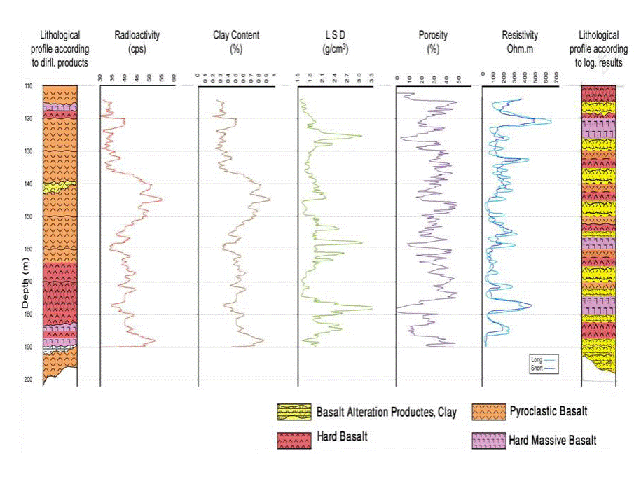 Figure 2 shows the different logs obtained in the Kodana borehole. Those logs include the natural gamma ray (cps), the density LSD log (g/cm3), the porosity (%), and the short and long normal resistivity (Ohm-m) (Asfahani, 2011). The logs shown in Figure 2 cover only the saturated Neogene basalt aquifer from a depth of 110m. The water level and the interface between the saturated and non-saturated zones were already determined by neutron-porosity logs (Asfahani, 2011), as shown in Figure 3. The lithological description of the traversed layers in the saturated basaltic zone, shown in the right side of Figure 2 was established according to the different mentioned borehole logging results and their statistical treatment (Asfahani, 2011).