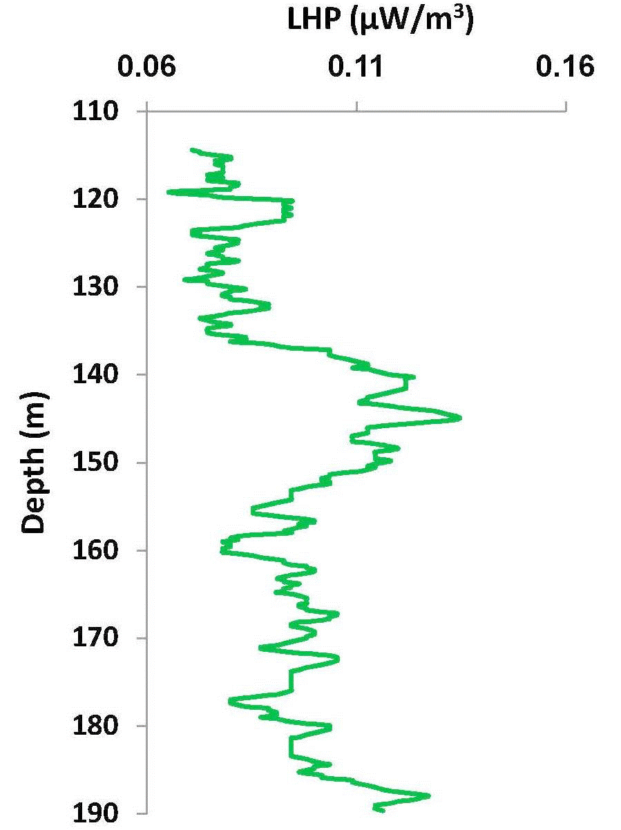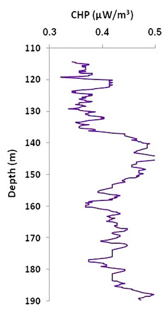 | Number | Depth (m) | eU (ppm) | eTh (ppm) | K% | Density (g/cm3) | CHP μW/m3 | LHP μW/m3 |