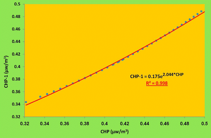 Figure 9 confirms the excellent agreement between the corrected radioactive heat production results (CHP) discussed above and those (CHP-1) obtained by applying the new proposed modified equation (6). The R2 regression coefficient between (CHP) and (CHP-1) is 0.998. The absolute and relative errors between (CHP) and (CHP-1) do not exceed 0.0221 and 6.87% respectively.