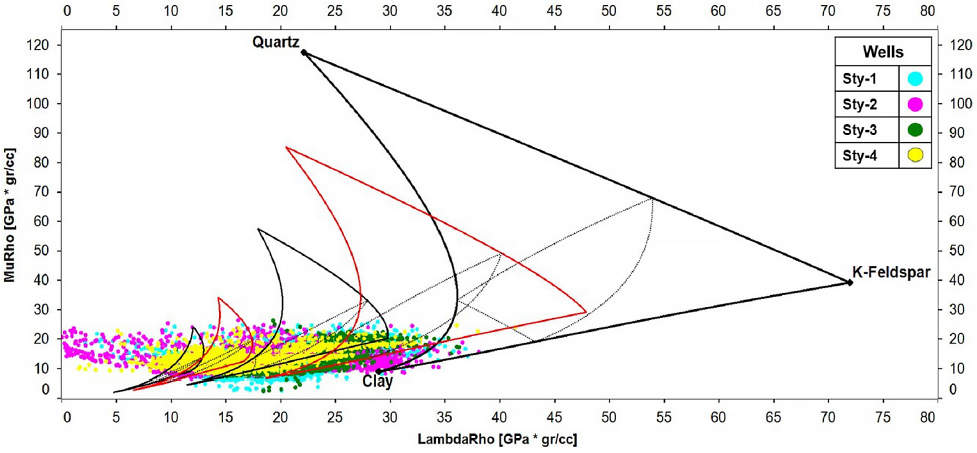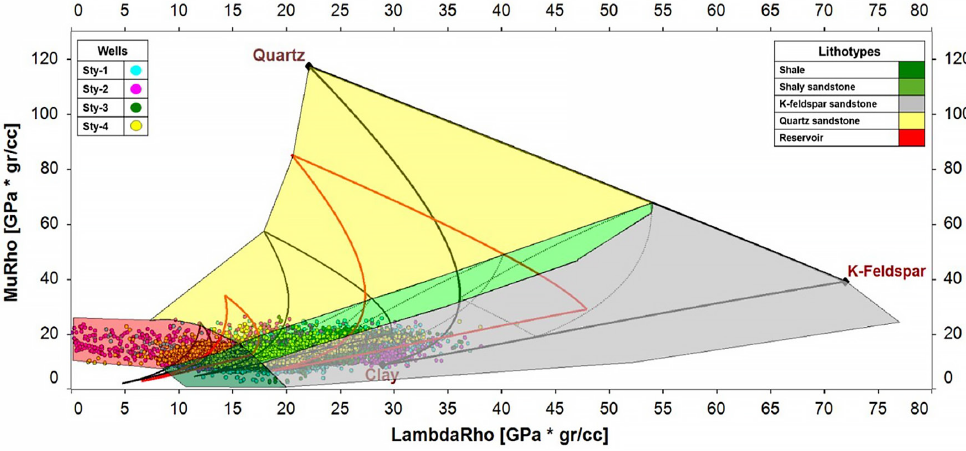 In Figure 10, the elastic responses of wells from Figure 9 are plotted together with RPT. The point cloud of each color used corresponds to the elastic information of each of the four wells in the study area. Thus, the blue points correspond to Sty-1, green points to Sty-2, red points to Sty-3 well, and yellow points to Sty-4 well. The