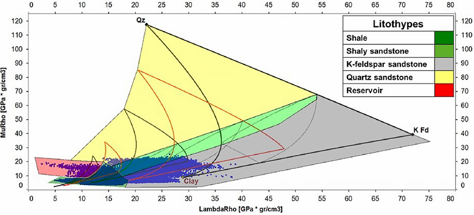 The petroelastic models can be defined as a connection between reservoir properties and seismic attributes of the subsurface structures. This connection is used to link seismic parameters such as acoustic and shear impedances (Ip & Is) with rock's elastic parameters as shear modulus (μ), Lamé parameter (λ), Young's Modulus (E), and Poisson's ratio (v) (Danaei et al., 2020). A well-known methodology for interpreting the amplitudes from pre-stacked seismic reflection data to produce a probabilistic distribution of subsurface lithology and pore fluid information is described in Avseth et al. (2005). As part of this sort of contribution, in which relationships between seismic and elastic parameters are noted, the job of Danaei et al. (2020) has established a connection between petroelastic information and 4D seismic information. It was carried out to optimize volumes to identify pore pressure and fluid saturation variations. Similarly, Uhlemann et al. (2016) correlated the seismic velocities with seismic tomography to highlight the importance of the modulus of elasticity (M) for a better characterization in identifying potential hydrocarbon zones with seismic images of high resolution. Bredesen et al. (2021) demonstrated how to perform a quantitative reservoir characterization using rock physics models on seismic inversion data, achieving consistent predictions of a gas-condensate reservoir.
