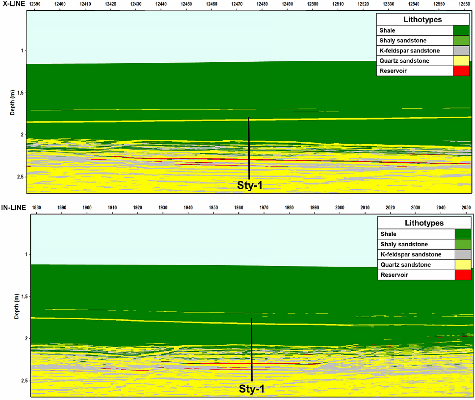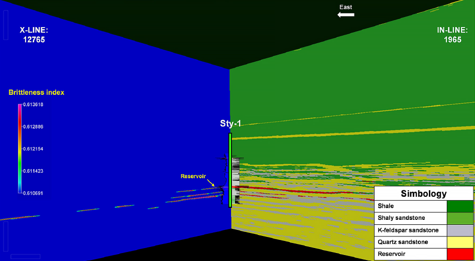 Finally, in Figure 21, the integration of workflow results of both petroelastic interpretation and brittleness analysis are shown. The in-line: 1965 and cross-line: 12765 corresponds to Sty-1, and the reservoir zone in red was identified at well scale and delineated at seismic scale. 3D visualization of lithotype distribution, Figure 15, and higher values of