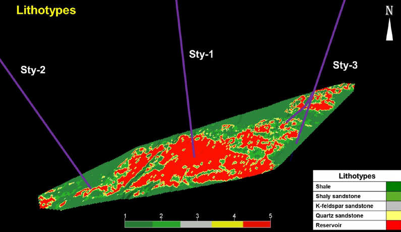 In Figure 15, stratal slice analysis focused on the spatial distribution of the reservoir was performed. Remember that this is a 3D visualization of the selection of intervals in red from Figure 13. These points are colored zones in red in Figures 14 and 15. Sty-1 well clearly dropped in the best zone of the reservoir because it landed in the broader area in red. Commercial output is often linked to the vast presence of pore-filling fluid. In contrast, Sty-2 and Sty-3 were drilled in a sparse area in red. Sty-4, a re-entry of Sty-3, also dropped in a scarce area in red. The proposed 1D-3D interpretation of lithologies integrated with field and production well reports can assist in defining hydrocarbon-rich zones within the target stratum.