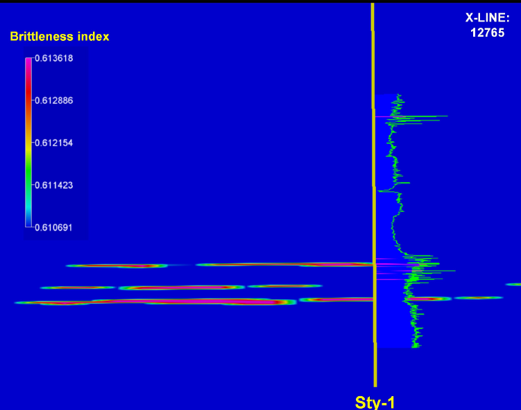 Figure 19 shows 1D-3D brittleness modeling conducted on in-line and x-line corresponding to the intersection with the Sty-1. Zones in red denote higher values of the BA brittleness index, consistent with the 1D brittleness analysis performed on Sty-1. The horizontal spatial distribution is related to the lateral continuity of brittle intervals at the target stratum, and vertical variations can underpin well paths to drill the most significant number of brittle intervals.