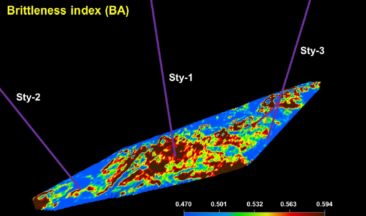 The same stratal slice, Figure 15, is used to portray the spatial distribution of brittle zones and landing area of the well paths, Figure 20. Regions in red were discriminated by cutting the higher values of the BA brittleness index. For example, at the target stratum, Sty-1 was placed into a sizeable brittle zone; Sty-2 and Sty-3 were drilled in poor brittleness zones; and Sty-4, a re-entry well from Sty-3, was redirected to an area with higher brittleness. This brittleness analysis carried out on wells and stratal slices, features the BA brittleness index as a new reservoir indicator.