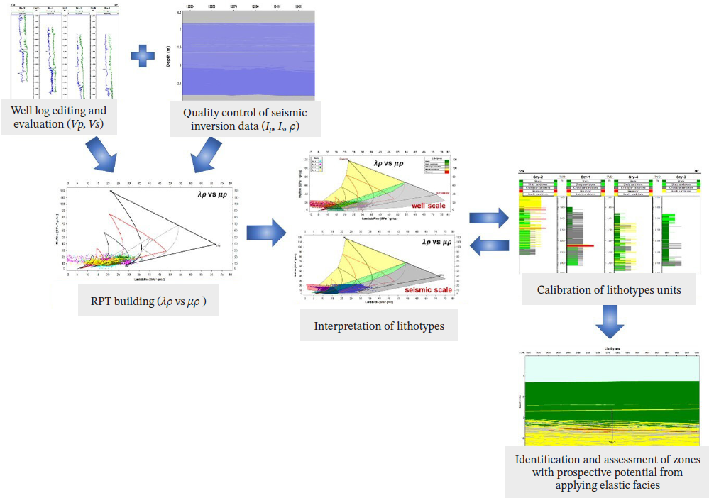 In the present study, we also worked with rock's elastic parameters, e.g., the modulus of elasticity, lambda-rho, or mu-rho, with the difference that a micromechanical quantitative method was used. This investigation focused on identifying potential prospective hydrocarbon reservoir zones through the lithological interpretation workflow via computing elastic properties from well-logs and seismic volumes. The objective was to establish the coupled relationship that exists between the elastic parameters at well and seismic scales to determine the lithological configuration of a study area, thus simplifying the scaling process and the prediction and identification of lithologies and areas of oil interest (reservoir) making possible the scaling of any elastic parameter in 3D seismic inversion data.