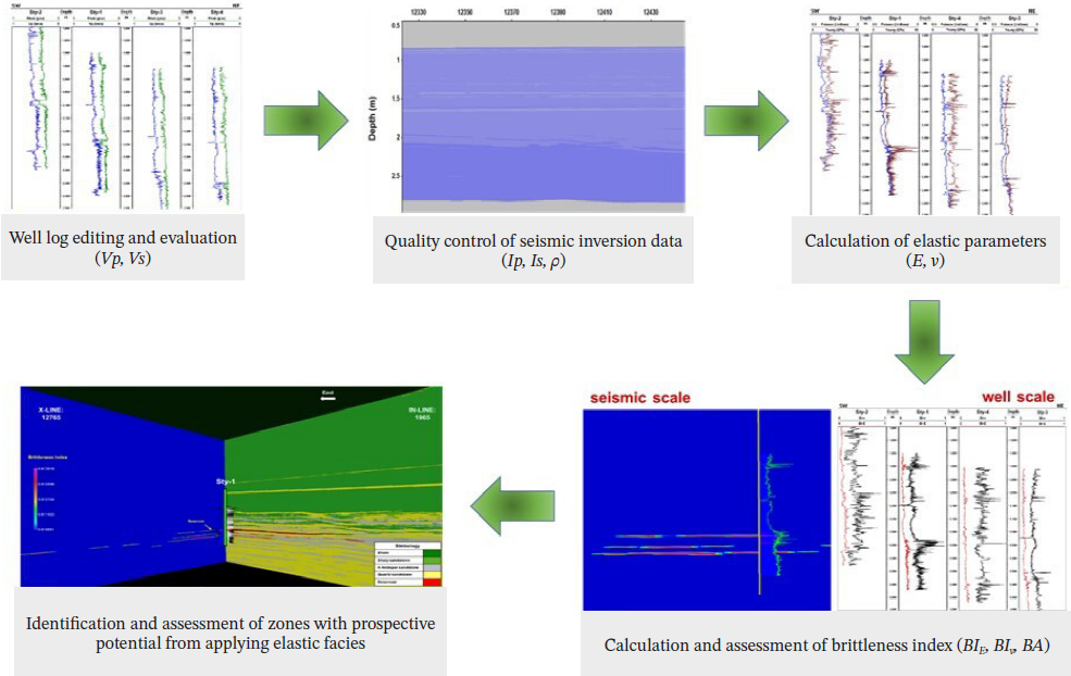 Figure 5 Novel workflow for 1D-3D brittleness analysis for identifying areas with reservoir potential using enhanced 1D brittleness methodology (Lizcano et al., 2018).