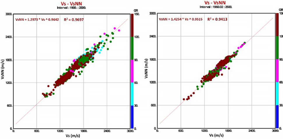 Figure 8 shows the validation of Vs results obtained with NN against actual Vs logs for the Sty-1 and Sty-3 wells. The relationships obtained are those mentioned in the following equations,