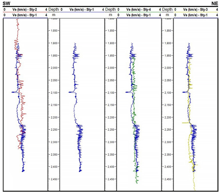 Figure 8 Value-range-based calibration of modeled Vs well logs. Sty-1 is the correlation well for qualitative analysis in tracks.