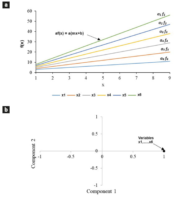 Figure 1 Parallel lines of gradually change variables (a), perfectly represented variables by component 1 (b).