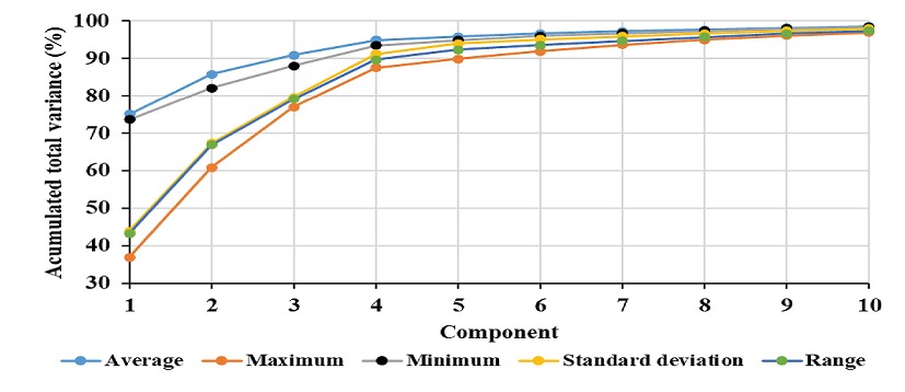 The accumulated total variance of T ave,d , T max,d , T min,d , T SD,d , and T Ra,d , represented by the principal components are shown in Figure 10. The PCA showed that three components represented about 90% of the accumulated total variance of T ave,d and T min,d statistics, while four components did it for T max,d , T SD,d , and T Ra,d . Components 1, 2, and 3 represented about 75%, 9%, and 5% of T ave,d and T min,d total variance, respectively. T SD,d , and T Ra,d had a similar representation of accumulated variance by the components, the first three components represented 79% of the accumulated total variance. Components 1, 2, and 3 represented about 44%, 23%, and 12% of the accumulated total variance of T SD,d , and T Ra,d . T max,d was represented in less measure for the first three components with a value of 77%. Components 1, 2, and 3 represented 37%, 24%, and 16% of the accumulated total variance of T max,d , respectively.