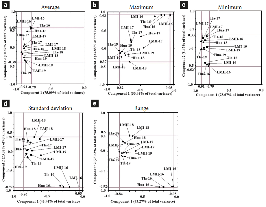 The correlations or L values (equation 4) of the sixteen weather station-year groups, with two principal components, are shown in Figure 11. It can see that the dots, which represent a weather station and a year of T ave,d and T min,d had similar dot distribution in the graph but different positions for each specific weather-year group (Figures 11a and 11c). T SD,d and T Ra,d had similar dots distribution and position (Figures 11d and 11e). The dots of T max,d (Figure 11b) differ concerning the other four statistics. The correlations between T ave,d and component 1 was around -0.78 to -0.92, and the correlations with component 2 were about -0.38 to 0.55 (red lines). T ave,d of four weather stations in 2016 formed a group because they had positive correlations of about 0.5 with component 2. The correlations between T max,d and component 1 was about -0.06 to -0.82, and the correlations with component 2 were about -0.37 to 0.93. The four weather stations in 2016 formed a group because their correlation rounded 0.9 with component 2. T min,d had correlations with component 1 from -0.91 to -0.79 and with component 2, from -0.91 to -0.79. T min,d in 2019 had the lowest correlation with component 2, while in the T ave,d analysis, the weather stations in 2017 had the lowest correlations with this component. T SD,d and T Ra,d had correlations of about -0.05 to -0.9 with component 1 and about -0.9 to 0.4 with component 2. Due to this, the weather stations of 2017, 2018, and 2019 formed a group, while the weather stations of 2016 formed another.