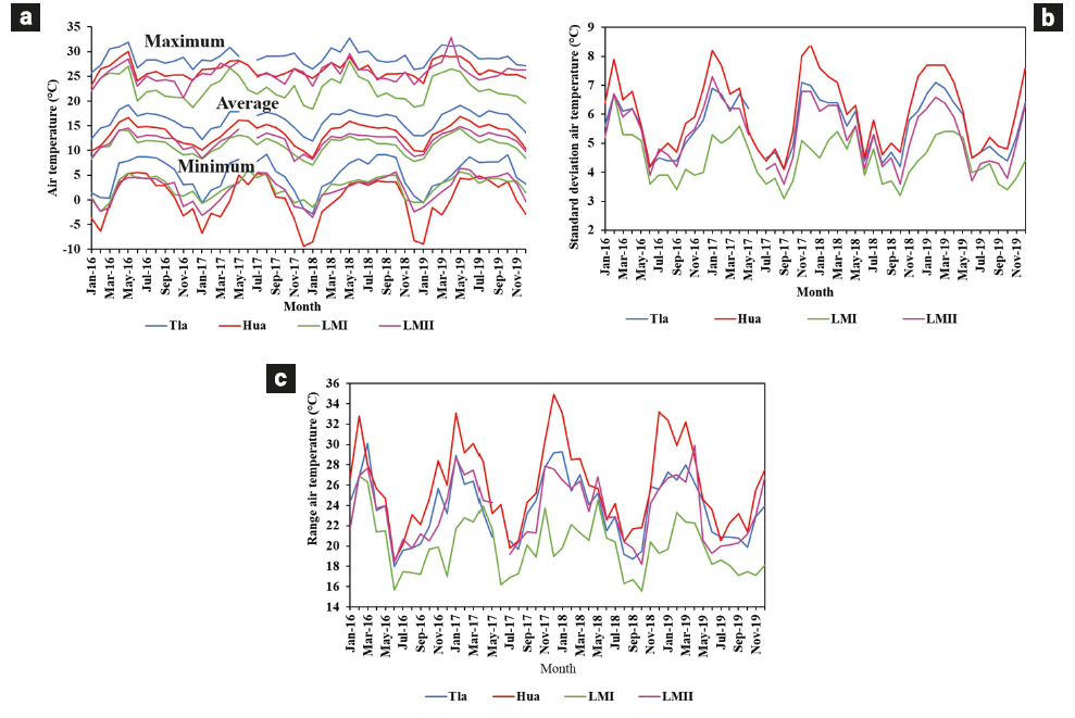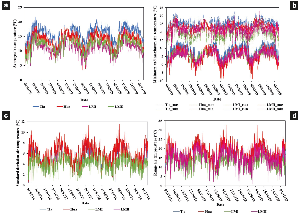 The average (T ave,d ), minimum (T min,d ), maximum (T max,d ), standard deviation (T SD,d ) and range (T Ra,d ) daily air temperature, calculated with T 10 data are depicted in Figure 8. The average daily air temperature (blue line) of the Tla weather station is on top, followed by Hua (red line), LMII (pink line), and LMI (green line) weather stations (Figure 8a), this kind of behavior is shown too in the maximum daily air temperature (Figure 8b), but no like that in the case of minimum air temperature, which behavior was as follows: Tla, LMI, LMII, and Hua weather stations (Figure 8b). For the case of standard deviation and range statistics, the Hua weather station is on top, followed by Tla, LMII, and LMI weather stations (Figure 8, c, and d). The lowest and highest values and their corresponding date are in Table 3. The lowest T ave,d was calculated in Hua weather station, and the highest was calculated in Tla weather station. As to T max,d , the lowest and highest values were calculated in the LMII weather station. The lowest and highest T min,d were calculated in the same weather stations as the calculated for average. Concerning T SD,d and T Ra,d , the lowest and highest were calculated in LMII and Hua weather stations, respectively. The lowest values of these statistics occurred in winter, and the highest occurred in spring.