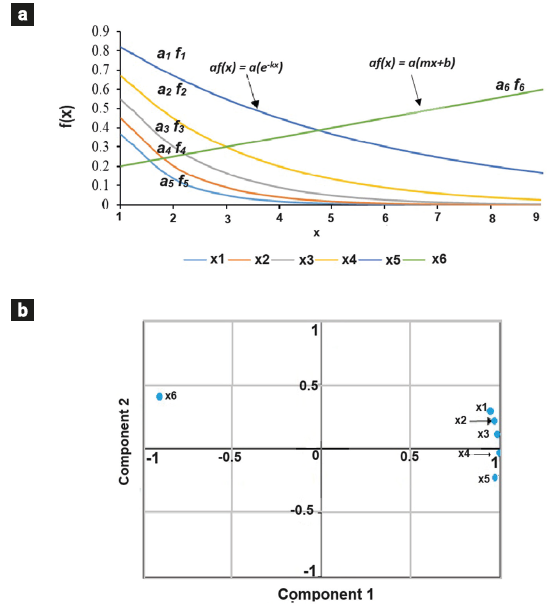 Figure 1a shows parallel lines (f(x)=mx+b) of a correlated variables system. Each line is a vector fi (x) multiplied by a scalar αi. The sum of vectors multiplied by its respective scalar gives a new vector f multiplied by a respective scalar α, which is to say, the lines are a linear combination. This new vector is the principal component and represents the linear combination of the original variables (Joliffe and Cadima, 2016). The variables of this example can be represented perfectly by the principal component (Figure 1b) due to the correlations or loading between the original variables, and the principal component is equal to 1. Similarly, in an undisturbed environment, the gradual change of air temperature in a topography area can be represented graphically as parallel lines or patterns and then by principal components. On the contrary, when a line is not parallel to the others (Figure 2a) due to the system being modified or perturbed, the variables are represented by two principal components (Figure 2b). In the first example, one principal component represents all original variables; in the second example, the representation is partitioned by two components. The use of principal components to explore patterns and perturbations is reported in the literature (Abid et al., 2018; Blommer and Rehm, 2014; Imtiaz and Sarwate, 2016; Hajrya and Mechbal, 2013). On the basis above described, we analyzed the modifications of air temperature gradient among urban, agricultural, and forest environments in the Mexican Highland.