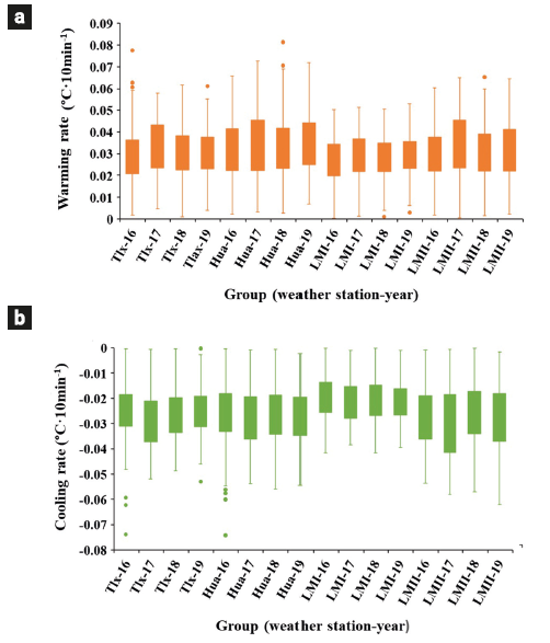 The correlation coefficients of T 10 versus time were significant (p<0.05) in all sixteen groups (4 years X 4 weather stations). The box and whisker plots of warming and cooling rates are in Figure 4. The average warming rates had an interval from 2.6×10-2 °C·10 min-1 (in the LMI weather station and 2016 year, abbreviated as LMI-16) to 3.4×10-2 °C·10 min-1 (Hua-19). The minimum warming rate had values from 3.1×10-4 °C·10 min-1 (LMI-16) to 6.9×10-3 °C·10 min-1 (Hua-19), and maximum warming rates were from 5.0×10-2 °C·10 min-1 (LMI-16) to 8.1×10-2 °C·10 min-1 (Hua-19). The ranges had values from 5.0×10-2 (LMI-18) to 7.9×10-2 °C·10 min-1 (Hua-18), and the standard deviations were from 9.6×10-3 °C·10 min-1 (LMI-19) to 1.5×10-2 °C·10 min-1 (Hua-17).