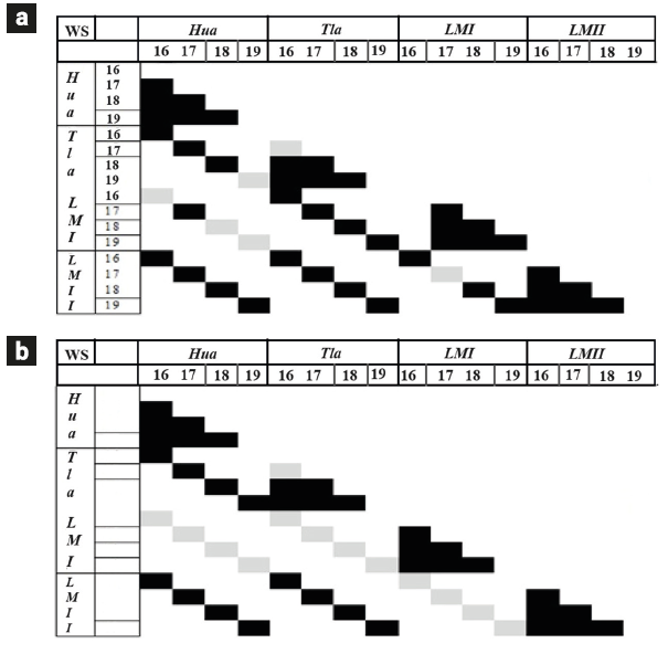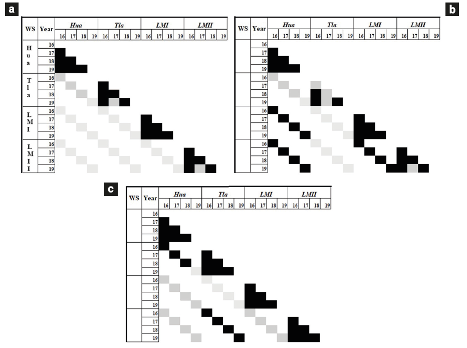 A comparison of the warming and cooling rates groups with K-W is shown in the matrix of Figure 5. The blocks indicate a group (a pair of weather station-years). The black blocks mean that a group had no significant difference (p>0.05), and the grey blocks indicate that a group had a significant difference (p<0.05). The two matrices (Figure 5a and Figure 5b) have similar distribution of the blocks. That means that in the weather station year, the warming and cooling rates are similar with the K-W test, except for the diagonals´ blocks marked by the ellipses. The diagonals show that at the Tla and LMI, and the LMI and LMII weather stations, the warming rates showed no significant differences, while the cooling rates did. The Hua and LMI weather stations significantly differed in the warming and cooling rates. The warming and cooling rates in the years in each weather station had no significant difference, except for 2016 and 2017 at the Tla weather station. In percentage terms, the matrix warming rates had (6/48)*100= 12.5% of grey blocks, while the matrix cooling rates had (13/48)*100= 27% of grey blocks, both with significant differences.