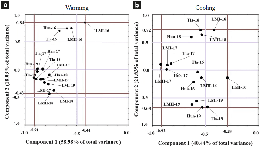 The principal component analysis (PCA) showed that three components represented 84% of the accumulated total variance of warming rates in the sixteen groups (Figure 6). The eigenvalue (λi) of each component represents the total variance of the original variable. Components 1, 2, and 3 represented 59%, 18%, and 7% of the total variance, respectively. Figure 7a shows the correlations of the warming rates of the sixteen groups with the components 1 and 2. The correlation or loading between the original variables and components is given by L values (equation 4). The warming rates with component 1 had correlation values from -0.91 to -0.41, and with component 2, they had values from -0.43 to 0.84 (indicated with red lines in the figures). These correlations values formed two subgroups of weather stations based on years, one composite with 2017, 2018 and 2019, and another with 2016.